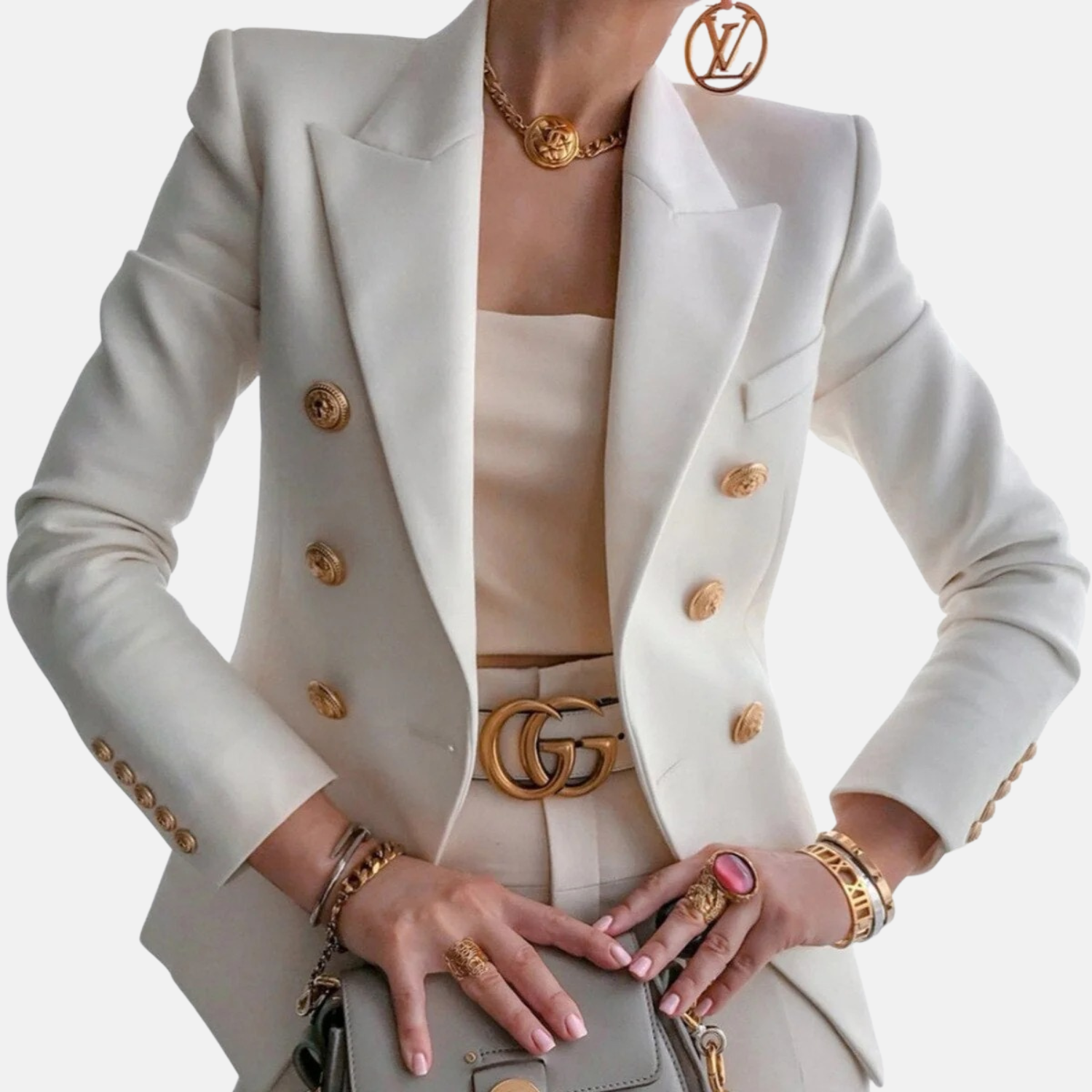 Un blazer double-boutonnage qui allie coupe ajustée et détails dorés, pour une élégance affirmée en toutes occasions.